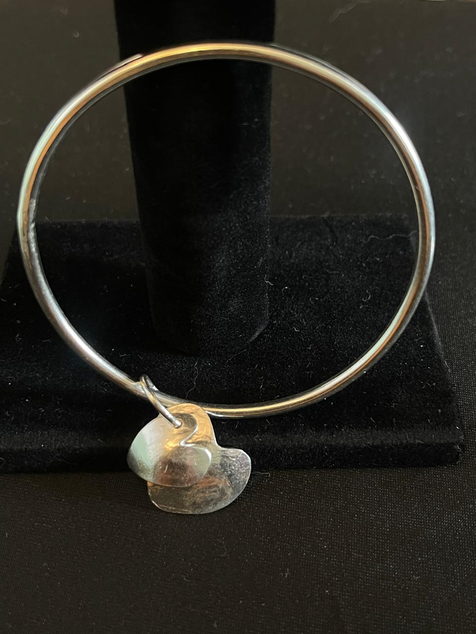 Pulsera plata 950 sólida con colgante diseño corazón feccionada a mano. Diámetro Interno: 6,4 cms talla S y 7 cms talla M. Grosor pulsera: 3mm
